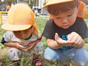 じりじりと照りつける陽射しに、夏の訪れを感じる季節となりました。戸外遊びでは、帽子をかぶって元気に遊ぶ子どもたちの姿が見られます。しゃがんで「ばあ!」と笑顔を見せる姿に、まわりも思わず笑顔になります。これからは水遊びも始 […]