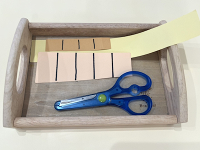 紙を線に沿って切ることで、指先の力や動きを意識的に使う経験を重ねます。一回切り、連続切りなど、子ども一人ひとりの成長に合わせて紙の大きさや形を調整していきます。切る動作を通して、目と手の協応や集中力を養いながら、達成感も味わうことができます。