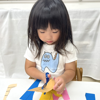 はさみの輪に指を通し、もう一方の手で紙を持って切っていきます。「チョキン、チョキン」とリズムよく切るたびに、「できた!」と嬉しそうな表情を見せていましたよ。