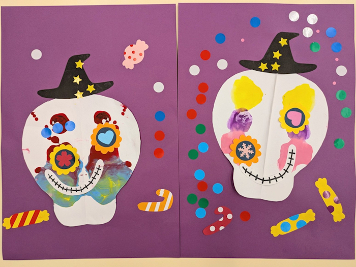 10月は「ガイコツのデカルコマニー」の制作を行いました。好きな色の絵の具を選び、スタンプを押したり、色を重ねたり、垂らしたりしながら、絵の具遊びを楽しみました。画用紙をそーっと広げると、左右対称に広がった絵が出来上がり、にっこりと喜んだ表情を見せてくれました。