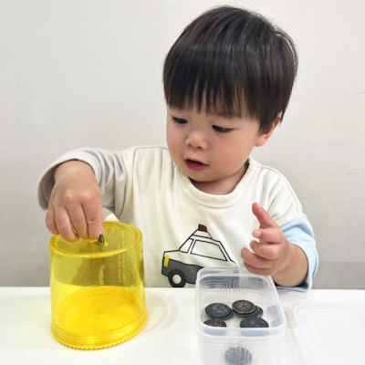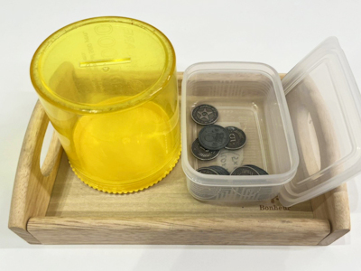 小さなコインを投入口に入れて落とす活動で、成功しやすいため、0〜2歳児でも取り組みやすいモンテッソーリのお仕事です。指先でコインをつまんで入れる動きは、手先の器用さや目と手の協応を育てます。