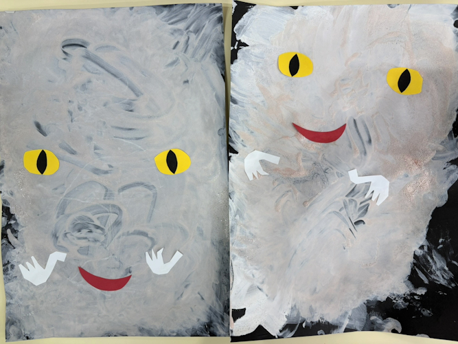 11月は「ねないこだれだのフィンガーペインティング」の制作を行いました。手に絵の具をつけると、初めは画用紙の端にそっと色をつけていましたが、絵の具の感触に慣れてくると、画用紙いっぱいに色を広げながら、ダイナミックに楽しんでくれました。