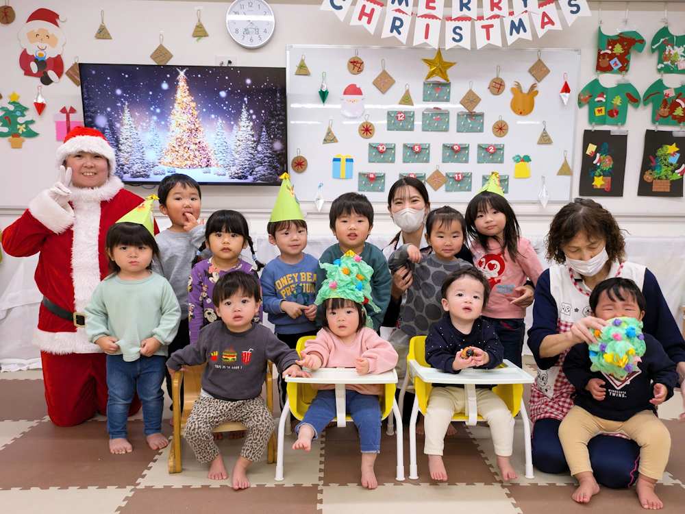 クリスマス会で、子どもたちはサンタさんから素敵な贈りものをもらいました。少し緊張していたお友だちもいましたが、プレゼントを受け取ると、目をきらきらと輝かせ、かわいい笑顔を見せてくれましたよ。プレゼントだけでなく、ダンスや歌、サンタさんとの交流、クリスマス特製の給食も楽しみ、心あたたまる一日を過ごしました。