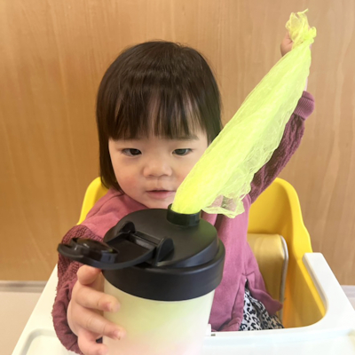 細い穴のあいた容器にスカーフを入れ、少しずつ引っ張り出して遊ぶ活動です。片手で容器を押さえ、もう一方の手で引っ張ることで、指先の力加減や手の動きを調整する力が育ちます。「出てくるかな?」と期待しながら集中して取り組めるため、達成感も味わえるお仕事です。
