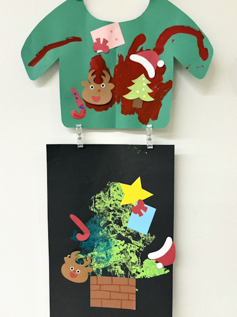 12月は「クリスマス」の制作を行いました。星組はいつもと違った感触のスタンプを楽しんでくれていました。宙組はシールの貼る位置や絵の具の塗り広げる場所など考えながら思い思いの表現を楽しんでいましたよ。