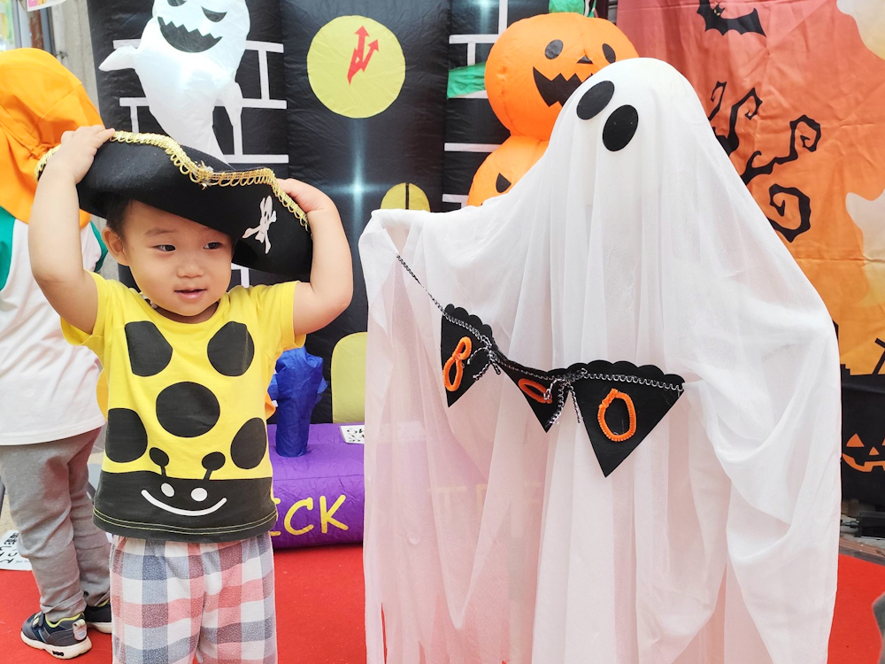 野田新橋筋商店街へお散歩に出かけました。商店街のハロウィンスポットでは、大きなお化けやかぼちゃの置き物に触れたり、海賊の帽子をかぶったりして大喜びの子どもたち。