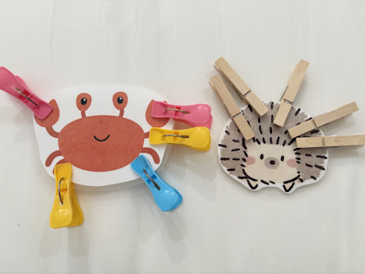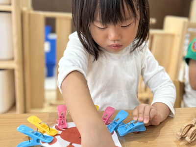 ハリネズミやカニの絵に、夢中で洗濯ばさみを挟む子どもたち。挟めたときには達成感たっぷりの笑顔を見せてくれました。これからは、ハンカチを干して“洗濯ごっこ”も楽しみたいと考えています。