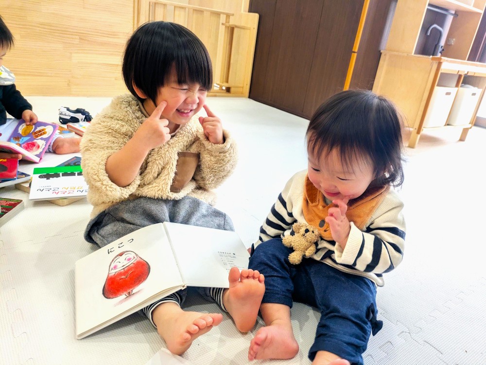 絵本を広げると、「にこっ」と笑ったり、ほっぺに指をあててまねっこをしたりと、可愛らしいやり取りが見られています。ページをめくるたびに顔を見合わせて笑い合う姿に、心もほっこり温かくなります。