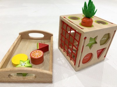 さまざまな形のピースを、同じ形の穴に入れていく教具です。ピースをつかむ、向きを考える、手首を動かしてはめ込むといった動作を通して、指先や手首の動きを育てていきます。形の違いを目で見て確かめる力や、自分の思い通りに手を動かす力へとつながっていきます。