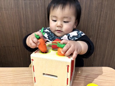 1歳頃から指先や手首の動きが活発になり、ピースをしっかりつかんで取り組む姿が見られます。はじめは形を気にせず入れようとしていましたが、繰り返すうちに穴をよく見て合わせようとするようになりました。