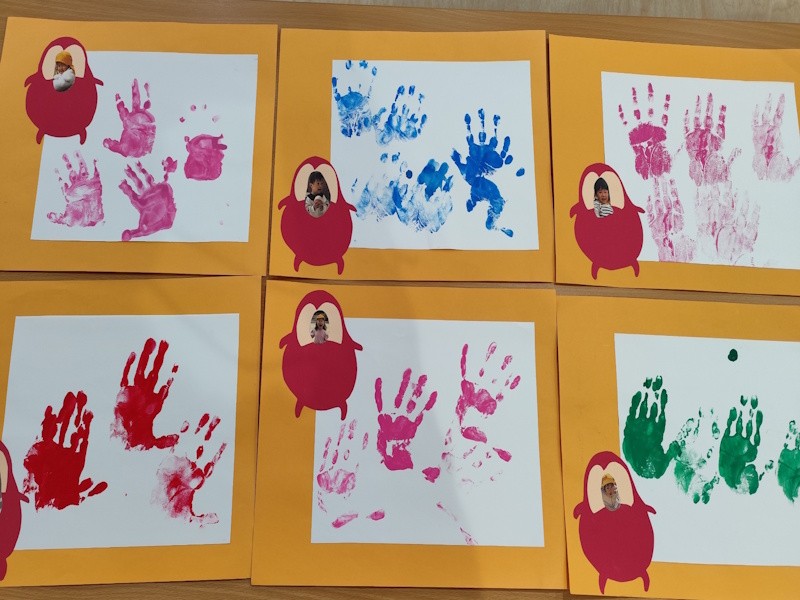 「〇〇ちゃんの手!」「〇〇くんの手!」と、一人ひとりの可愛らしい手形が並び、オリジナルの作品が完成しました。まだ絵の具の感触に慣れていなかった頃は、手に付くことを嫌がる姿も見られましたが、今回は嬉しそうに自分から手を差し出していて成長を感じるひとときとなりました。