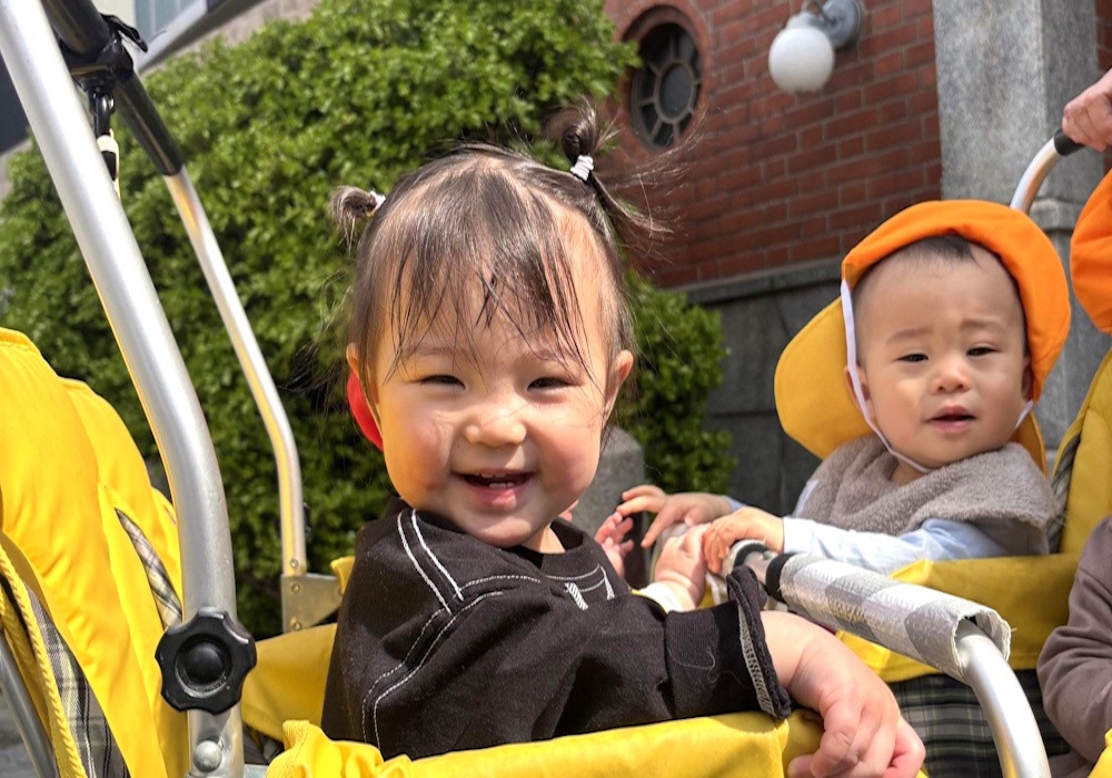 草花やちょうちょに興味を持ち、指をさして喜ぶ姿も見られ、季節の移り変わりを感じながら過ごしています。これからも戸外でのびのびと体を動かし、心地よい毎日を過ごしていきたいと思います。
