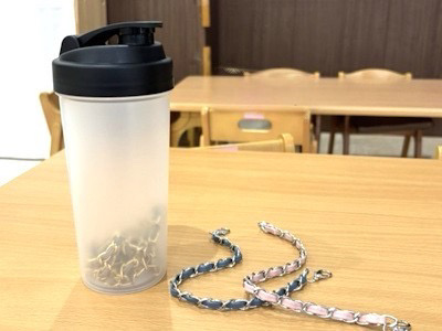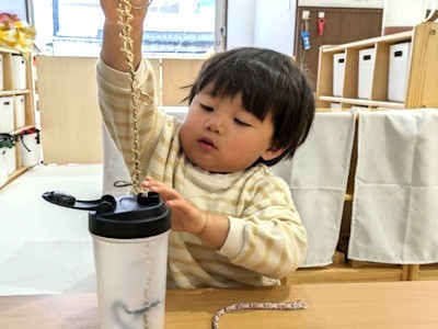 子どもはキラキラ光るチェーンに興味津々で、真剣な表情で穴へ押し込んでいました。最後まで入ると、「できた!」と満面の笑み。何度も容器から出してはまた入れて…夢中で繰り返し遊んでいます。