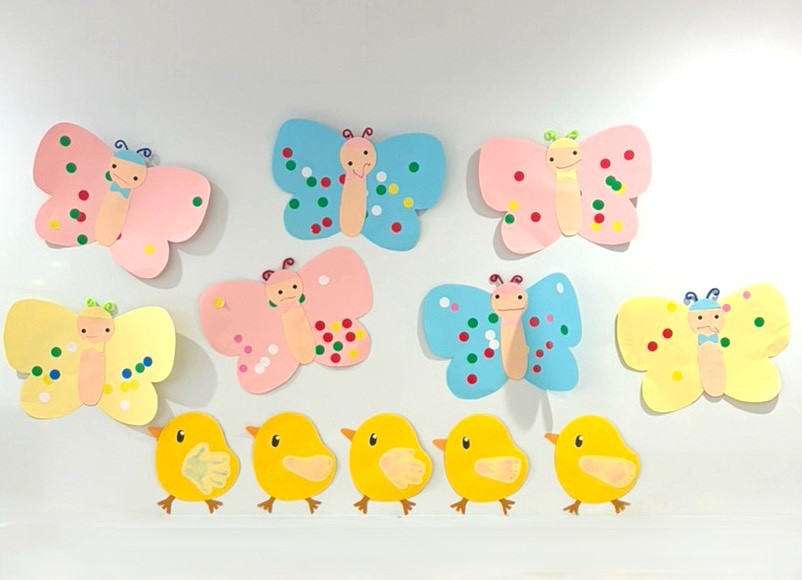 新入園児のお友だちは手形・足形を使って、愛らしい「ひよこ」を作りました。1・2歳児のお友だちは、シール貼りを楽しみながら羽を彩り、自分で顔を描いて「ちょうちょ」を完成させました。