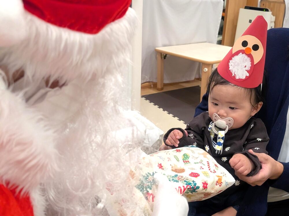 今年も残りわずかとなりました。園ではクリスマス会を行いました。サンタさんが登場すると、目を丸くして見つめたり、少し照れた表情を浮かべたりと、一人ひとりの反応がとても微笑ましかったです。プレゼントを受け取ると嬉しそうに大切そうに抱える姿も見られ、心あたたまるひとときとなりました。新しい年を迎える1月も、子どもたちが安心して笑顔で過ごせるよう、丁寧に保育を進めてまいります。