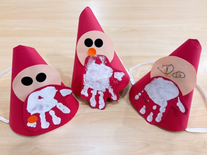 12月は「クリスマス帽子」の制作をしました。保育室にクリスマスの飾りが付いたり保育中の音楽もクリスマスの曲が流れ、子どもたちもクリスマスの雰囲気を感じてくれているようです。手型スタンプをとってサンタさんのおヒゲにして、月齢に合わせて目や口はシールを貼ったり、クレヨンで描きました。「できたー!」「おめめはなにいろかな〜」「サンタさんくるかな〜」と嬉しそうに作っていた子どもたちでした。