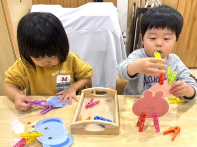 色とりどりのせんたくばさみを手に取ると、まずは「これ何色?」と色に興味を持ち、はじめは上手く力が入らず苦戦する姿もありましたが、何度も挑戦しているうちに「できた!」と笑顔で見せてくれるようになり、集中して黙々と取り組む様子が見られました。指先の力加減や動きがだんだん上手になってきています。