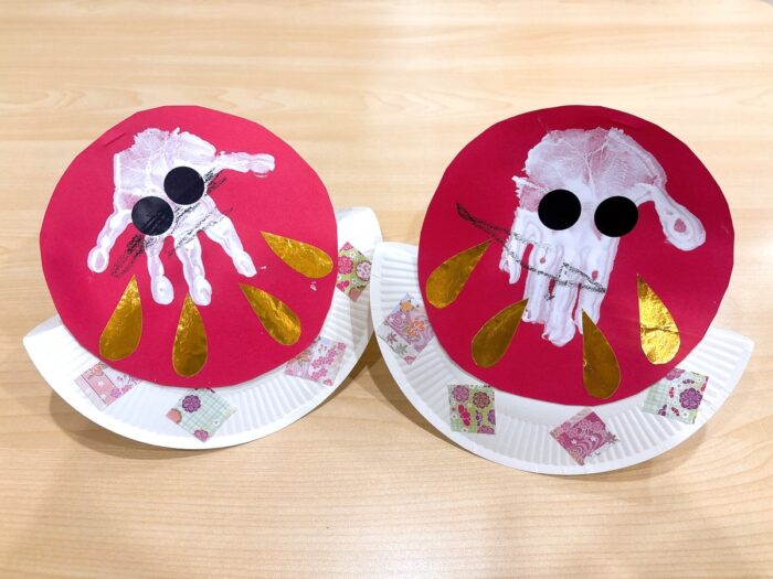 1月は「だるま」の制作をしました。手型スタンプは「おてて、おおきくなった!」や「ぺったんした!」と楽しそうに進めていました。2歳児クラスの子どもはのりを使って千代紙を貼る活動も行い、「はれたよー!」と嬉しそうに見せてくれました。「だるまさん」の絵本を保育園でも読んでいるので、子どもたちには馴染みのあるだるまさん。紙皿に貼り付けてユラユラ揺れるだるまさんが可愛らしいので、お家でも遊んでもらえたらと思います。