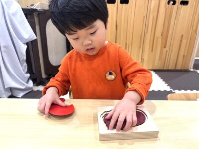 カラフルなパズルに子どもたちは興味津々。自分でピースを選び、手に取ってはめてみようと試みますが、順番が違うと小さいネコが入らなくなり、真剣な表情で考え直す姿も見られます。試行錯誤しピースがぴったりはまると嬉しさや達成感で満面な笑みがこぼれます。何度も集中して取り組んでいます。